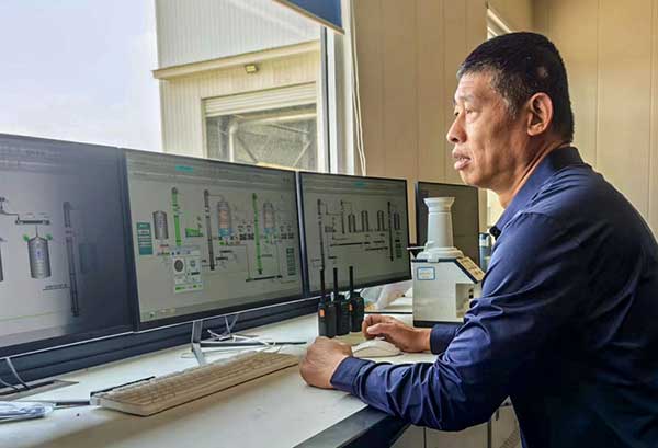 6月13日,在河北省齊河縣晏城街道糧食烘干倉儲服務中心,工作人員監測糧食烘干塔運行情況。新華社記者 陳灝 攝